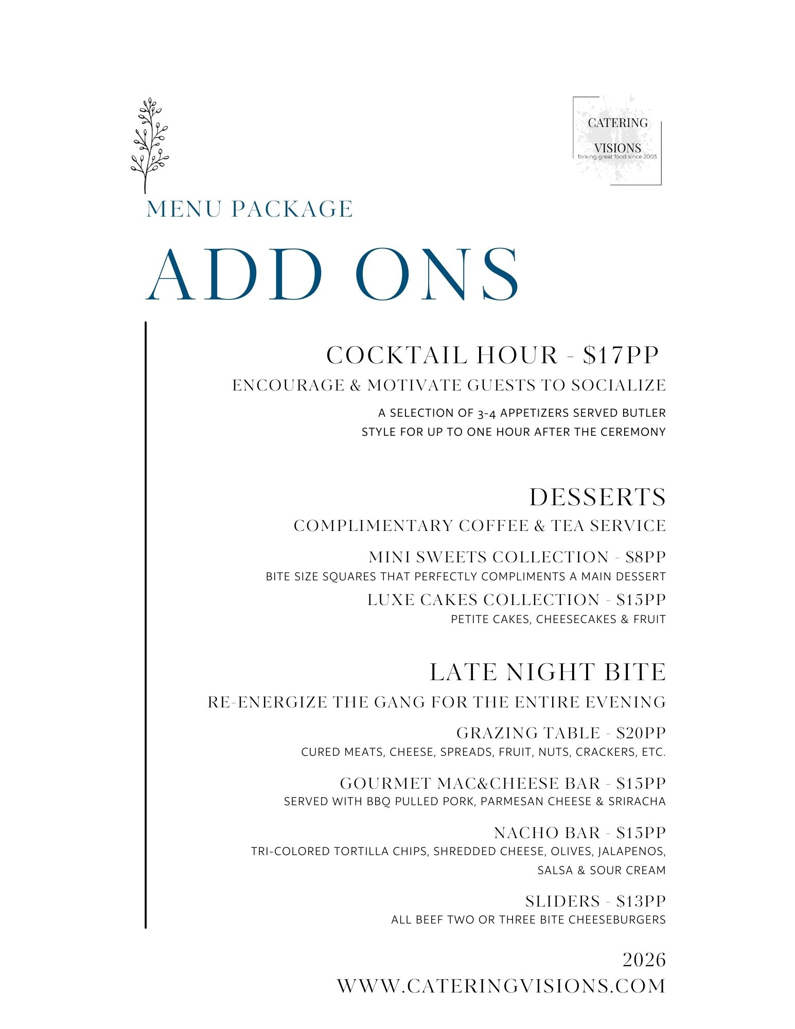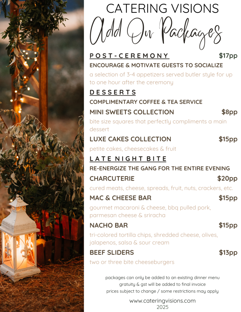 Menu Enhancements Catering Visions#1-13375 115th Ave.Surrey, BC V3R 0R8info@cateringvisions.comCatering Visions Availability Request NAME PHONE EMAIL Venue Dietary Instructions Number of expected Guests Event Date ADDITIONAL INFORMATION MENU ITEMS MENU ITEMS Weddings & Events Corporate Catering BBQ Catering Christmas Catering Memorial & Other SUBMIT REQUEST
