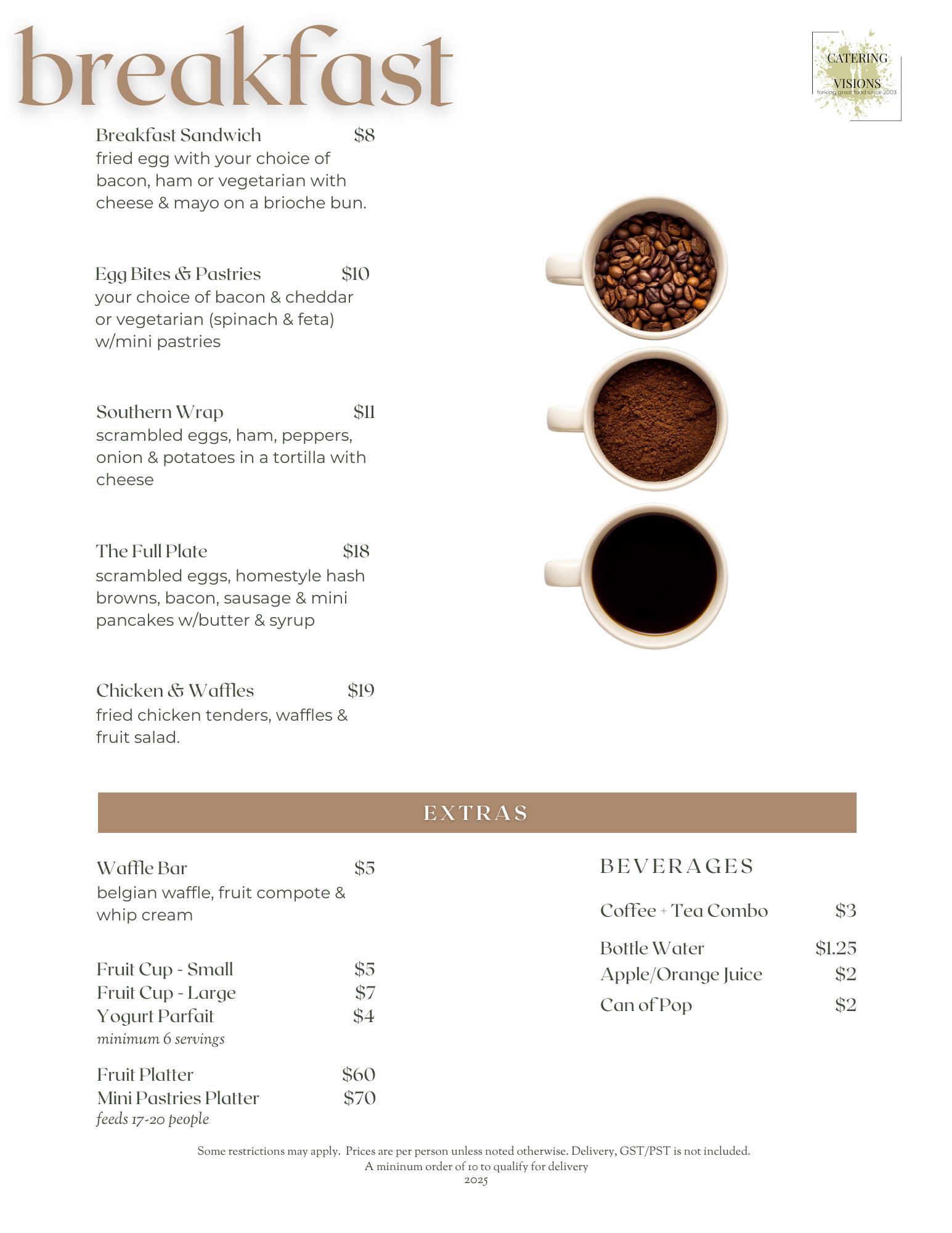 Corporate Breakfast Catering Visions#1-13375 115th Ave.Surrey, BC V3R 0R8info@cateringvisions.com Contact UsCatering Visions Availability Request NAME PHONE EMAIL Venue Dietary Instructions Number of expected Guests Event Date ADDITIONAL INFORMATION MENU ITEMS MENU ITEMS Weddings & Events Corporate Catering BBQ Catering Christmas Catering Memorial & Other SUBMIT REQUEST
