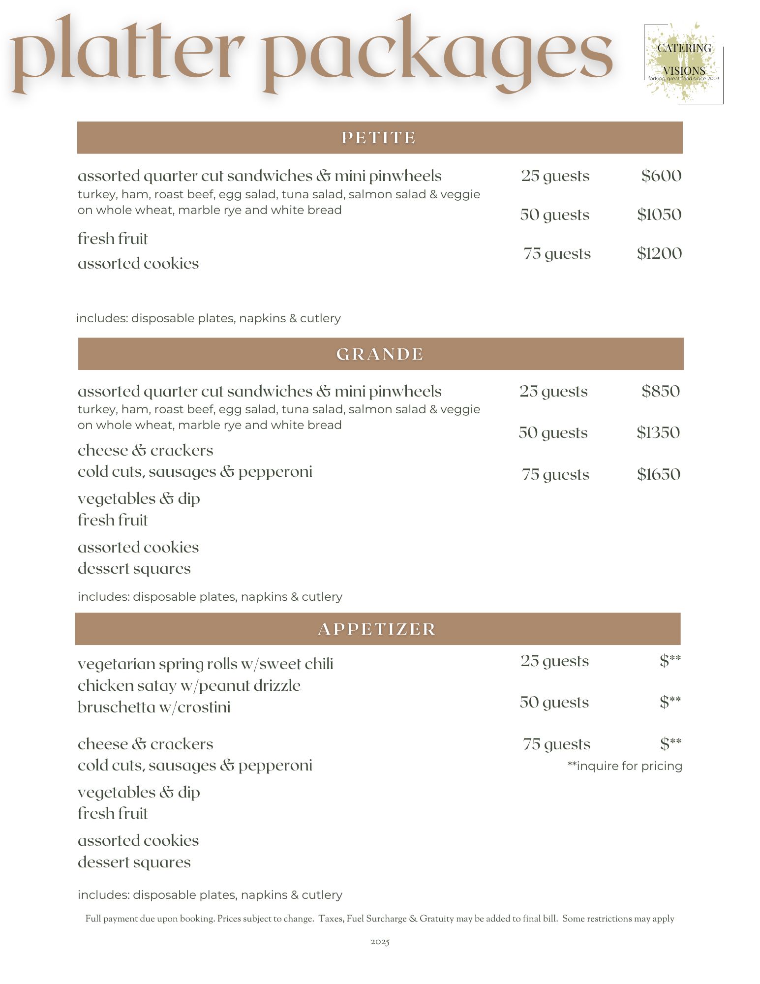 Platter Menus Catering Visions#1-13375 115th Ave.Surrey, BC V3R 0R8info@cateringvisions.com Contact UsCatering Visions Availability Request NAME PHONE EMAIL Venue Dietary Instructions Number of expected Guests Event Date ADDITIONAL INFORMATION MENU ITEMS MENU ITEMS Weddings & Events Corporate Catering BBQ Catering Christmas Catering Memorial & Other SUBMIT REQUEST